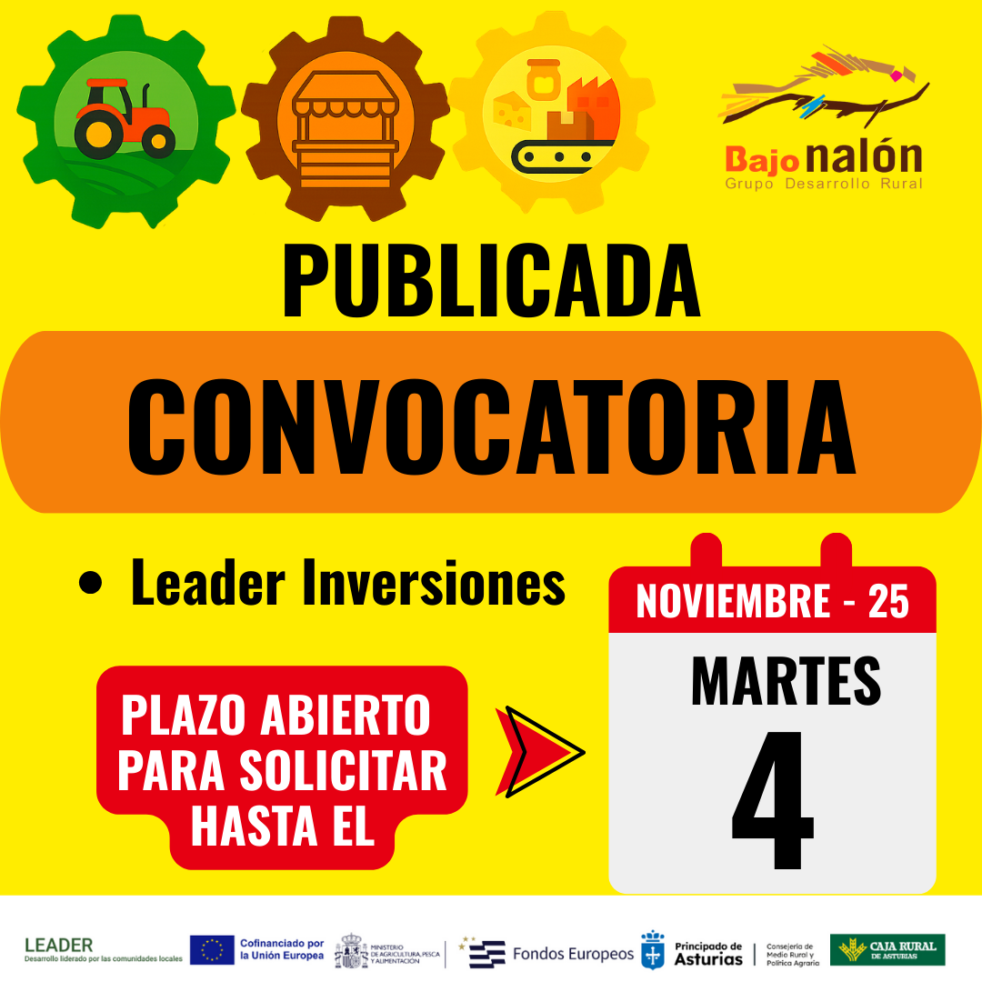 El Grupo de Acción Local del Bajo Nalón informa de la apertura del plazo para la presentación de solicitudes a la Convocatoria de Ayudas LEADER Inversión 2025, destinada a apoyar proyectos de emprendimiento, modernización y diversificación en el medio rural de la comarca.
